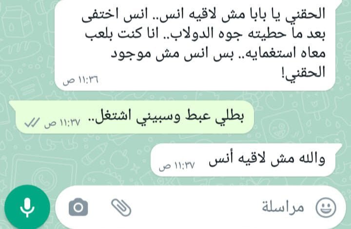 معرفتش اعمل ايه.. انس فص ملح وداب ولا كأنه كان موجود من دقائق جوه الدولاب.. اصل مش معقول يعني الدولاب هيبلع انس.. اتصلت على ماما كتير مكنتش بترد عليا.. وانا كنت خايفه جدا على اخويا.. بعت رساله لبابا على الواتس لانه مكنش بيرد عليا هو كمان.. بعتله وقلتله بابا الحقنى انا مش لاقياه.. انس اختفى جوه الدولاب.. بابا افتكر ان بهزر معاه بس حلفت له اني مش بهزر وانس فعلا مش موجود خالص ف البيت..